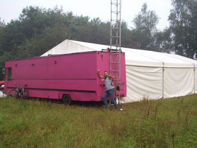De zender met eindtrap stonden in de Roze melkkarre, 900 watt vermogen stond