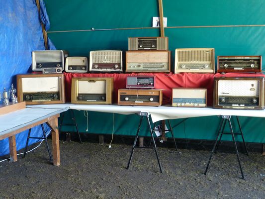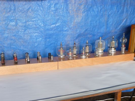 oude lampen radio's, zenders, versterkers, eigenbouw projecten, fabrieks materiaal en een verzameling buizen staan uitgestald.